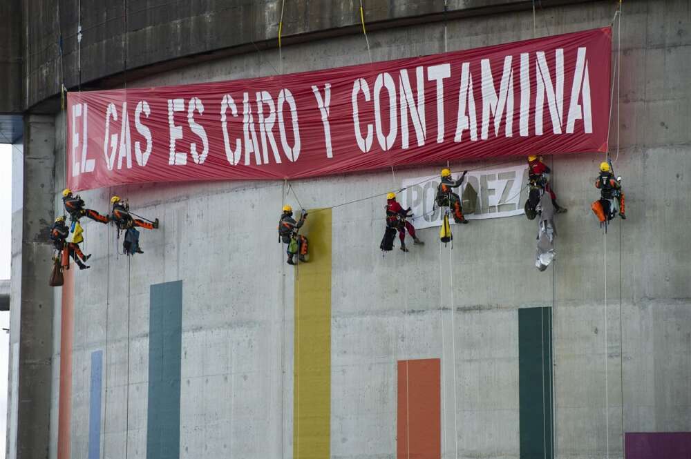 Allí, han mostrado pancartas con el lema ‘El gas es caro y contamina’, una de ellas y de grandes dimensiones que ha sido desplegada desde lo alto de esta infraestructura.