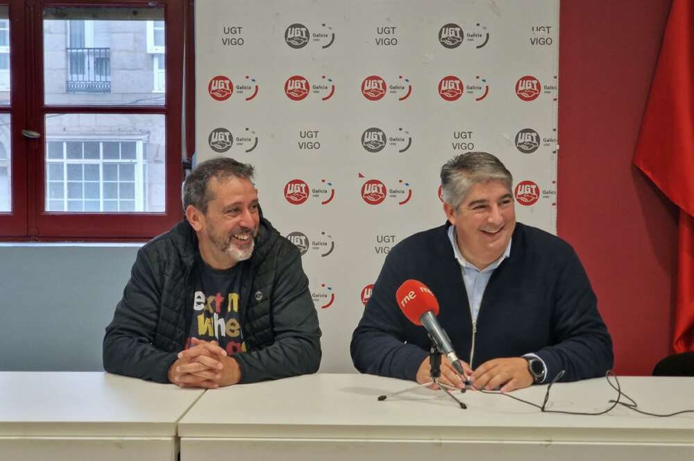 El secretario general del sector automovilístico de UGT Fica a nivel nacional, Jordi Carmona, junto al secretario general de Industria de UGT en Vigo, Rubén Pérez / Europa Press