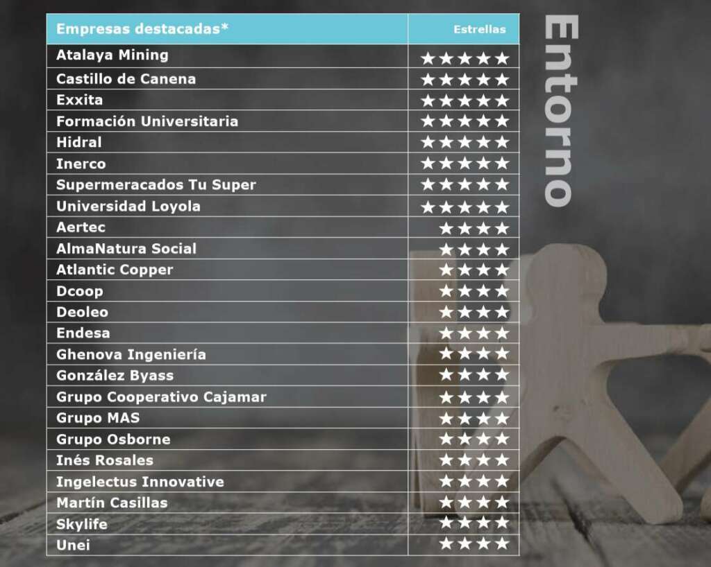 La solidez del compromiso con el entorno queda patente al observar que el buen desempeño no se limita a la cúspide. A este grupo de liderazgo se suma una representación de otras 16 compañías que han obtenido una calificación de 4 estrellas: Aertec, AlmaNatura Social, Atlantic Copper, Dcoop, Deoleo, Endesa, Ghenova Ingeniería, González Byass, Grupo Cooperativo Cajamar, Grupo MAS, Grupo Osborne, Inés Rosales, Ingelectus Innovative, Martín Casillas, Skylife y Unei.