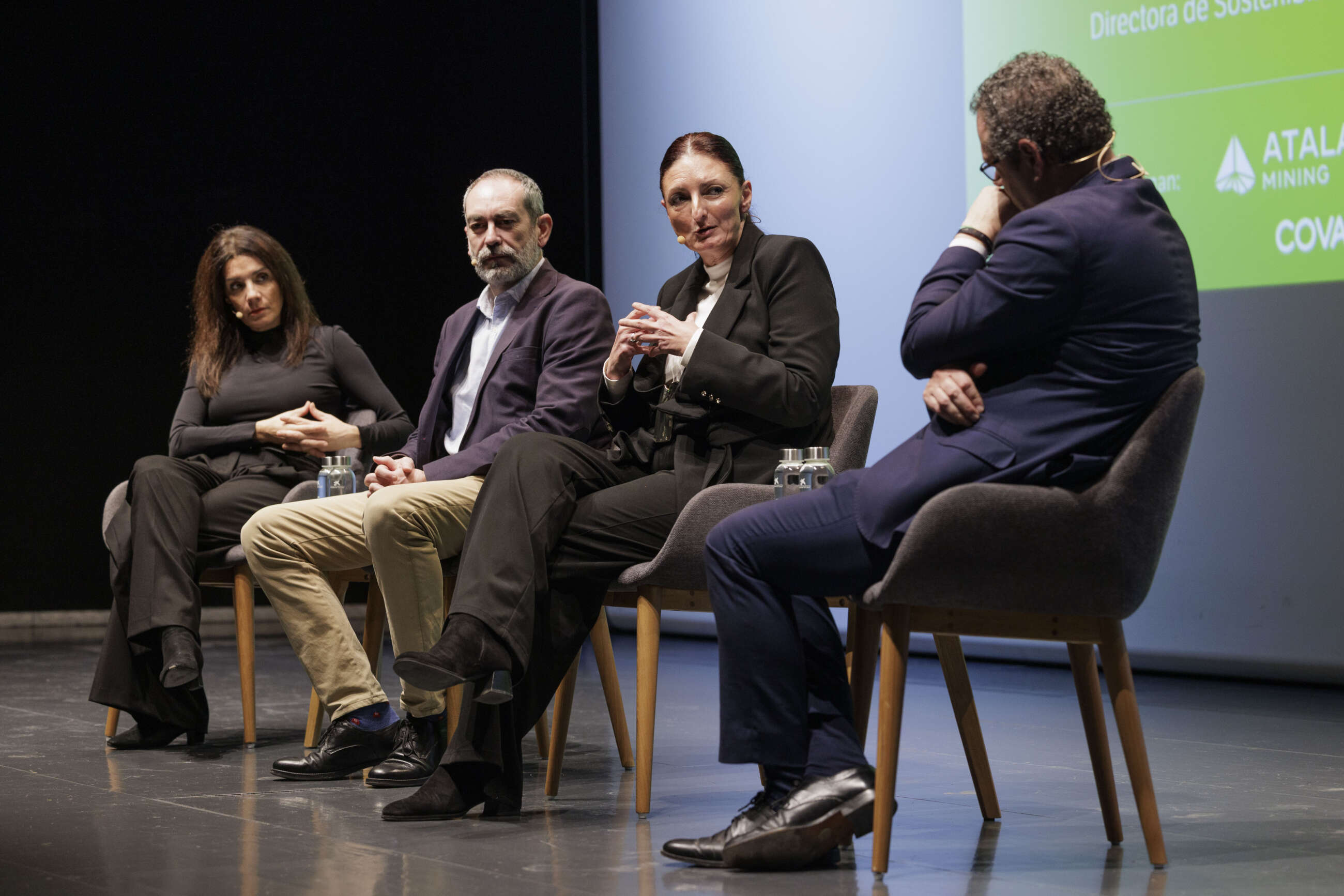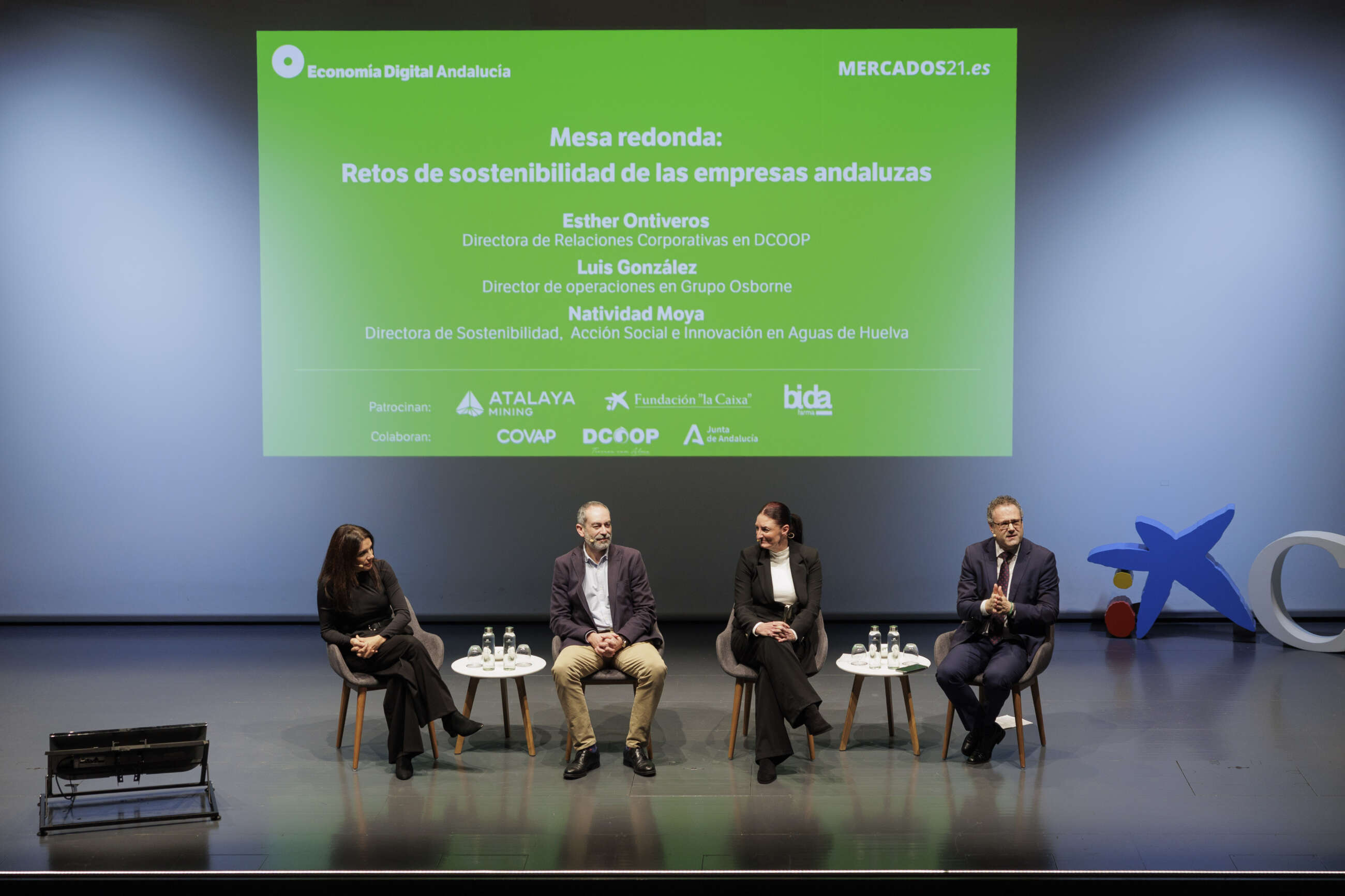 Esther Ontiveros (Dcoop), Luis González (Osborne), Natividad Moya (Aguas de Huelva) y Javier González Flores (Mercados21) participan en una mesa redonda durante la presentación del Atlas de Andalucía / ED