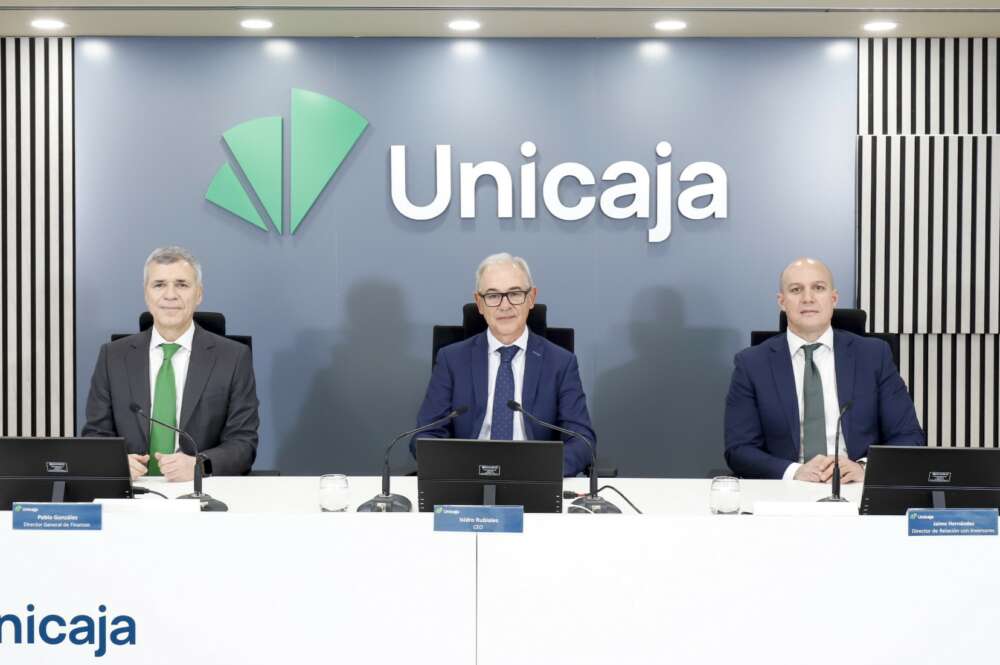 Pablo González (director general de finanzas), Isidro Rubiales (CEO) y Jaime Hernández, (director de relación con inversores), durante la presentación de resultados de 2025 de Unicaja. Imagen: Unicaja Banco
