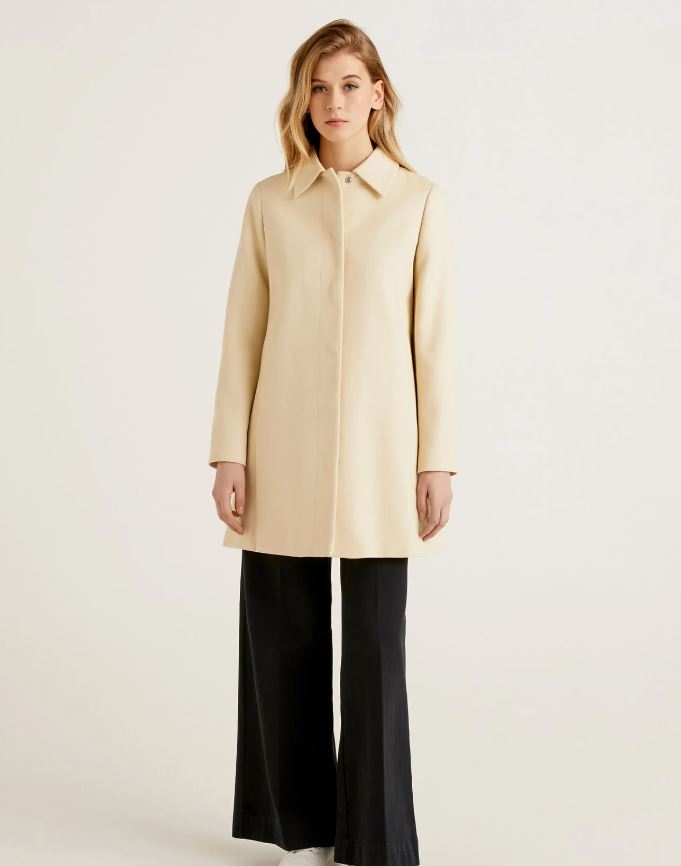Es un abrigo de cuello camisero y cierre con botones automáticos ocultos. Es muy sencillo, pero también muy elegante, ideal para ocasiones especiales o formales e incluso también para estilos más casual. Está disponible en todas las tallas y colores, desde azul a naranja, rojo, rosa palo o amarillo y podrás encontrarlo en Benetton por 99,95€.