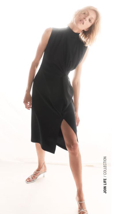 Se trata de un vestido midi con corte por encima de los tobillos, de cuello subido y una manga sisa que le otorga ese toque elegante. Una de sus mayores particularidades es su nudo con pliegues en la parte delantera del vestido que le da un aire diferente y con mucho estilo.