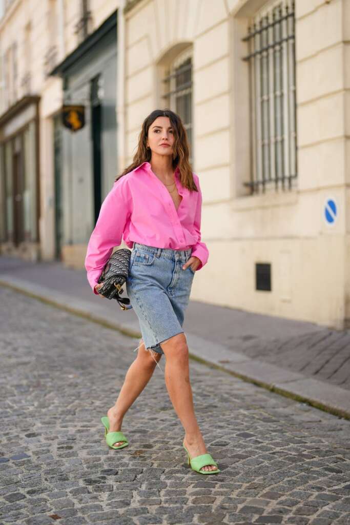 Otra combinación infalible son las bermudas con una camisa básica en algún color tendencia como el rosa fucsia o el verde. Así irás muy cómoda y serás la más estilosa en tus reuniones. Sácale más partido con accesorios a juego para completar el look como una blazer colorida y unos mules.