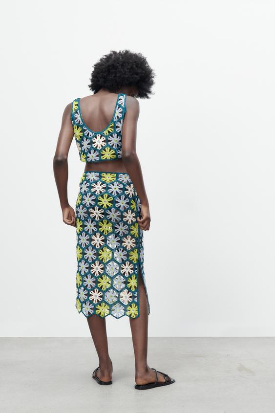 Este conjunto de Zara está compuesto por una falda midi de tiro alto, con cierre lateral con abertura y botón. Una falda super en tendencia tanto por el crochet como como por los colores verdes que no pueden llevarse más. El top de estilo cropped con escote redondo y tirantes anchos.