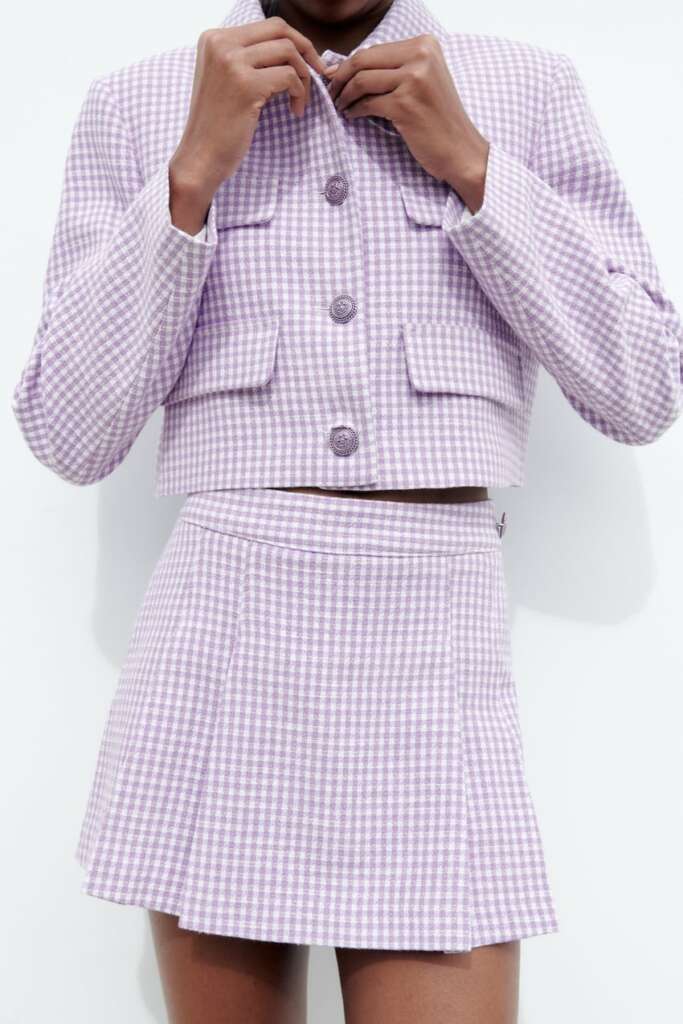 Para completar este conjunto, Zara se ha decantado por una bonita y favorecedora falda-pantalón corta de estructura con el mismo estampado de cuadros vichy en color lila pastel y blanco. Es de tiro alto con pliegues delanteros y tiene un falso bolsillo de vivo en espalda. Cuenta además con un cierre lateral con cremallera oculta en costura y botón. Podrás encontrarla en Zara a un precio de 25,95 euros.