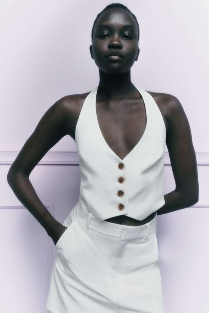 La parte de arriba de este conjunto se compone de un bonito top estilo chaleco con escote halter en pico y tirantes anchos y espalda descubierta. La parte del bajo es corta y con un diseño de picos simétricos a ambos lados de la botonadura frontal en color marrón que compone el cierre. Está disponible en color blanco en tallas desde la XS hasta la XL en tiendas físicas de Zara o en su página web a un precio de 25,95 euros.