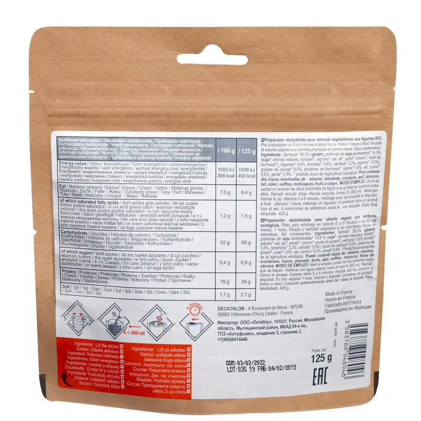 Se trata de sémola de verduras con un aporte energético adaptado y un peso mínimo de 145 gramos. Aporta 368 kcal de energía por cada 100 gramos de producto que se corresponde con un peso deshidratado de 125 gramos, lo que tendría un peso final rehidratado de 425 gramos. Es un alimento vegetariano y con certificado biológico que permite rehidratación en frío.