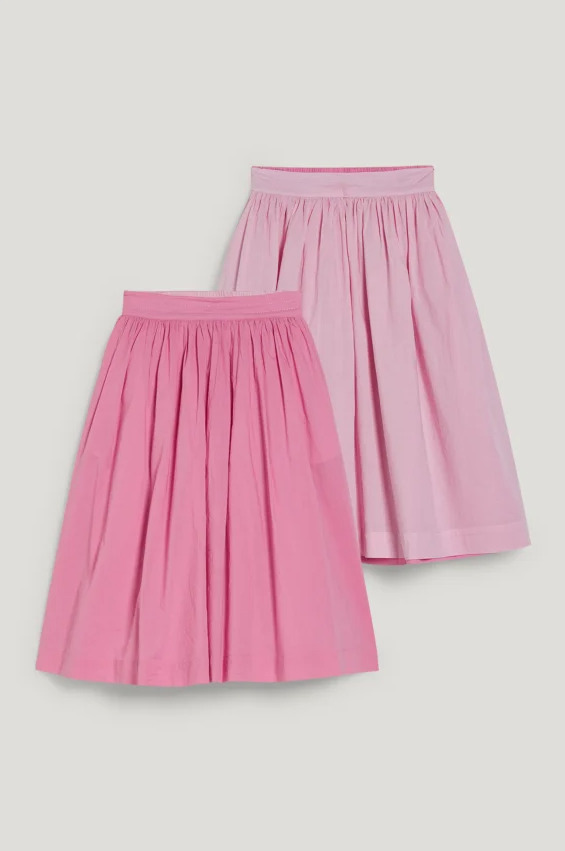 Esta falda reversible para niñas de C&A es justo lo que buscábamos. Es una falda amplia de tejido ligero y una bonita caída. Cuenta con una capa doble con cintura parcialmente elástica para que se ajuste bien a su cuerpo de una manera sencilla y cómoda. Su particularidad es que podrá ponérsela por ambos lados, cada uno con un tono de rosa diferente.