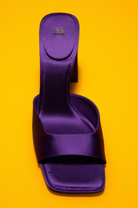 En este look de Zara también lo más espectacular son los zapatos y siguiendo con uno de los colores más en tendencia y que mejor combina con el amarillo. Un zapato tipo sandalia de tacón ancho estilo mule de raso y con acabado en punta cuadrada. Tiene un precio de 39.95 euros y esta disponible en todas las tallas.