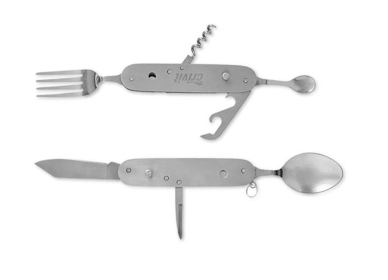 Al más puro estilo navaja suiza, estos cubiertos se pueden utilizar como tenedor, sacacorchos, abrelatas y abrebotellas, cucharilla, cuchara, navaja y punzón. Si los prefieres, también puedes encontrar cubiertos similares en Amazon.