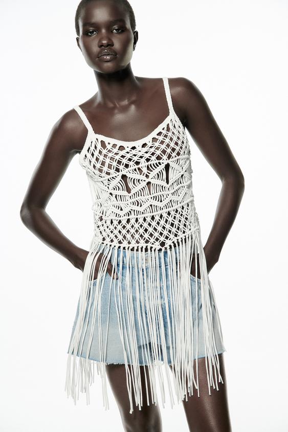 Una prenda que no puede faltar en tus looks festivaleros es un top de flecos y en Zara tienen uno ideal un top de punto calado con escote pico y tirantes finos y con el bajo acabado con flecos. Una idea super top para un festival pero también para el día a día, esta hecho de 100% algodón y su precio es de 39.95 euros.