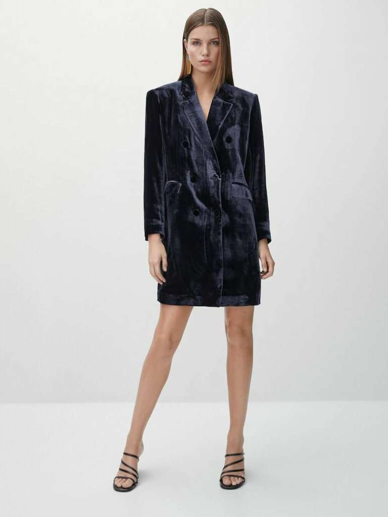 Si entramos en detalles nos encontramos ante una blazer con el cuello solapa de pico, un cierre cruzado mediante botonadura frontal, dos bolsillos con solapa y puños con botones. Está disponible desde la talla 34 a la 44 por un precio de 120 euros. También encontrarás el pantalón a juego. O sino, la otra opción es quedarte con la americana vestido. Exactamente igual que la anterior, de terciopelo, pero con un largo hasta el muslo.