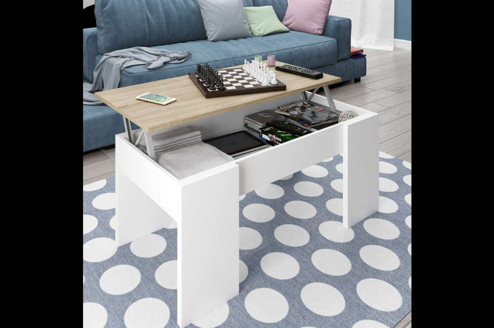 COMIFORT Mesa de Centro Elevable – Mueble con Revistero, Gran Almacenaje, Estilo Moderno, Muy Resistente, Fabricada en Europa, Color Blanco y Roble