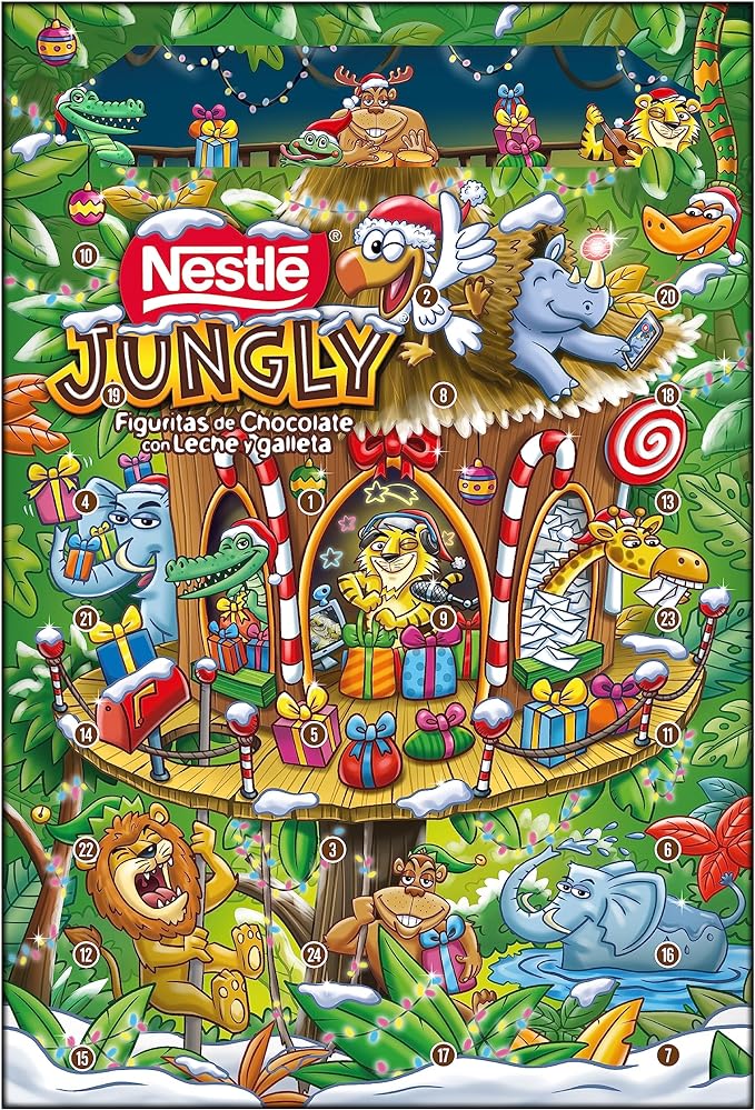 Un calendario de adviento es una combinación perfecta de diversión, sorpresa y emoción, ofreciendo una amplia gama de artículos y obsequios que van desde accesorios de papelería y juguetes hasta accesorios decorativos, lo que lo convierte en un tesoro a descubrir a diario. El calendario de adviento Jungly se destaca por su diseño único y por brindar momentos especiales para toda la familia con chocolatinas del famoso producto de Nestlé.