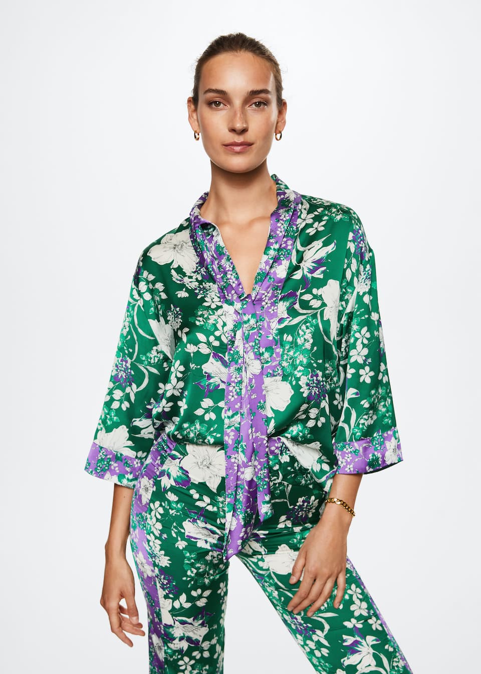 Este conjunto de inspiración asiática de Mango tiene un tejido fluido, con un diseño recto y con un estampado de flores. Tiene cierre lateral de cremallera este total look, pertenece a la colección fiesta y ceremonia.