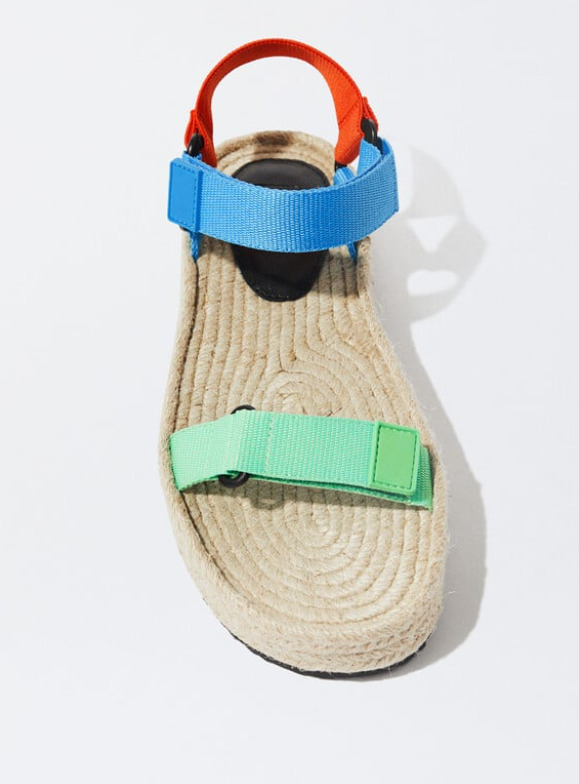 Se trata de unas sandalias de plataforma de yute plana, muy cómodas de llevar. Cuenta con unas tiras adhesivas ajustables de varios colores a modo de cierre, para que puedas ajustarlas fácilmente a tus pies de la forma más cómoda. Están acabadas en punta redonda y tienen un diseño que se adapta perfectamente a tus pies con un estilo que te enamorará nada más probártelas.