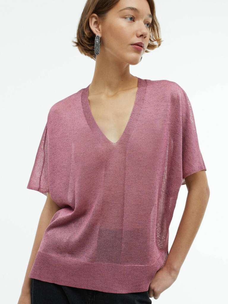 Es un tejido fino, pero muy confortable, no pasas excesivo calor, pero tampoco frío. Se trata de un jersey de punto de media manga, escote de pico e hilos metalizados que está disponible en tres colores. Rosa, gris y azul, el primero es el color de moda, así que se ha convertido en el favorito de muchas, incluso de nosotros. Lo puedes encontrar disponible en todas las tallas, es muy holgado, por 26 euros. Solo en Parfois.
