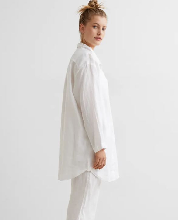 Para aquellos que prefieren la ropa oversize o de una sola pieza a modo de vestido o camisón, esta camisa de lino te permitirá disfrutar de esa comodidad con el estilo más glamuroso y elegante. Se trata de una camisa larga de lino por encima de las rodillas con cuello de camisa y abotonada en la parte delantera.