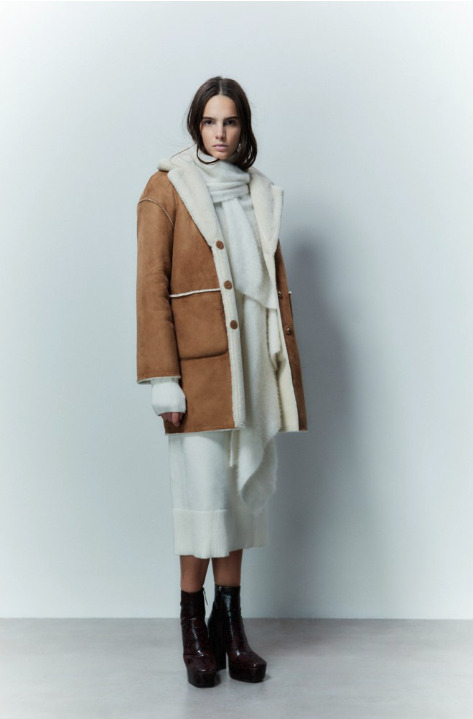 Por un lado es un tejido de pelo con detalles de piel de oveja blanca, por otro lado, está confeccionado íntegramente en borreguito con detalles de pelo en contraste. La verdad es que no sabemos cuál de los dos nos gusta más, y eso aumenta si le sumamos que está disponible en dos colores: crudo y marrón.