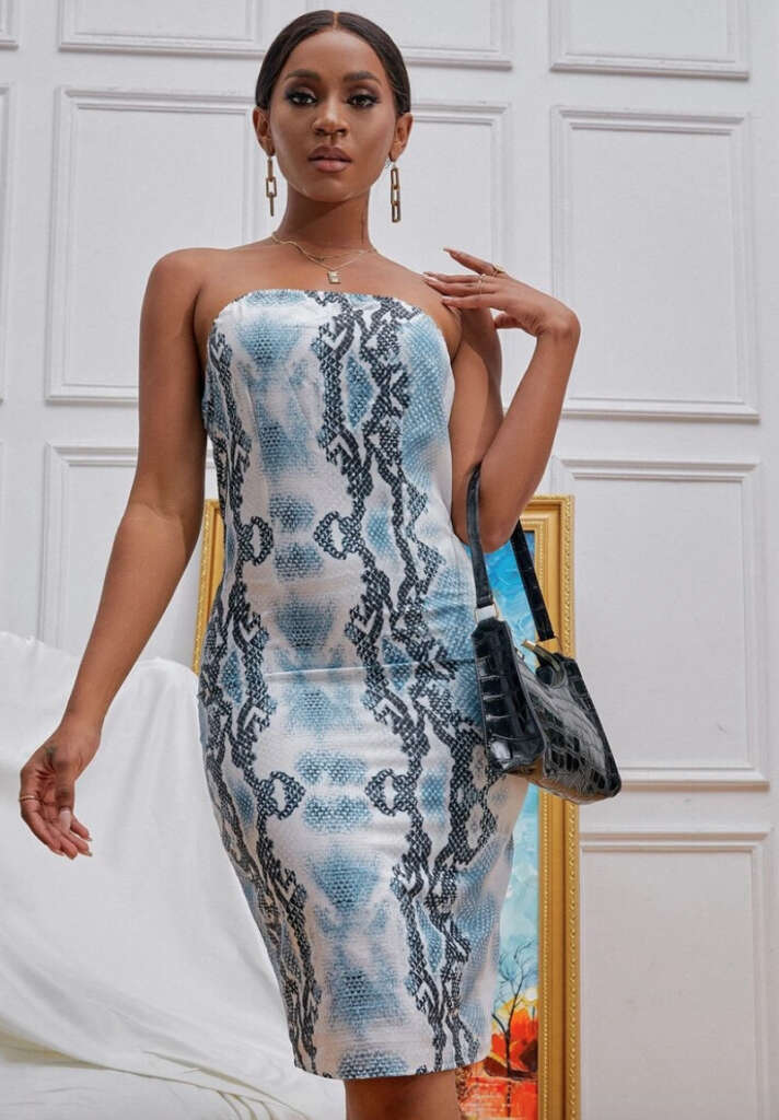 También se trata de un vestido de tubo con animal print estilo de serpiente. Es ajustado y se encuentra en varios colores. Gris, verde, azul y marrón, todos con el mismo estampado. Su precio es increíble. Solo cuesta 10 euros. Las tallas disponibles van de la XS a la L.