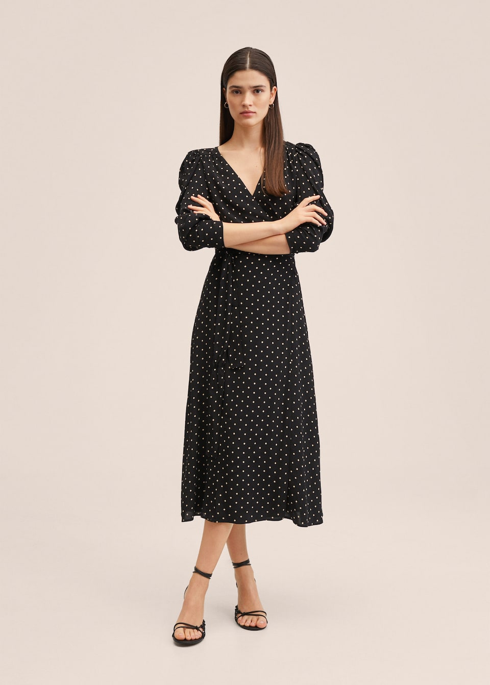 Otro vestido super favorecedor y que cambiando los complementos te valdrá para una ocasión más arreglada es este vestido cruzado de Mango. Esta prenda pertenece a la colección Committed. Tiene un tejido satinado, con un diseño largo y de evasé. Con estampado, cuello cruzado y manga larga abullonada. Además tiene un fruncido elástico en la cintura, forro interior, cierre de lazo lateral. Y lo mejor es que está disponible en talla Plus. Esta disponible en tres colores azul, amarillo y negro todos con el estampado de topos pero si quieres ir más elegante la mejor opción es el negro. Su precio con el descuento del 25% se queda en 29.99 euros.