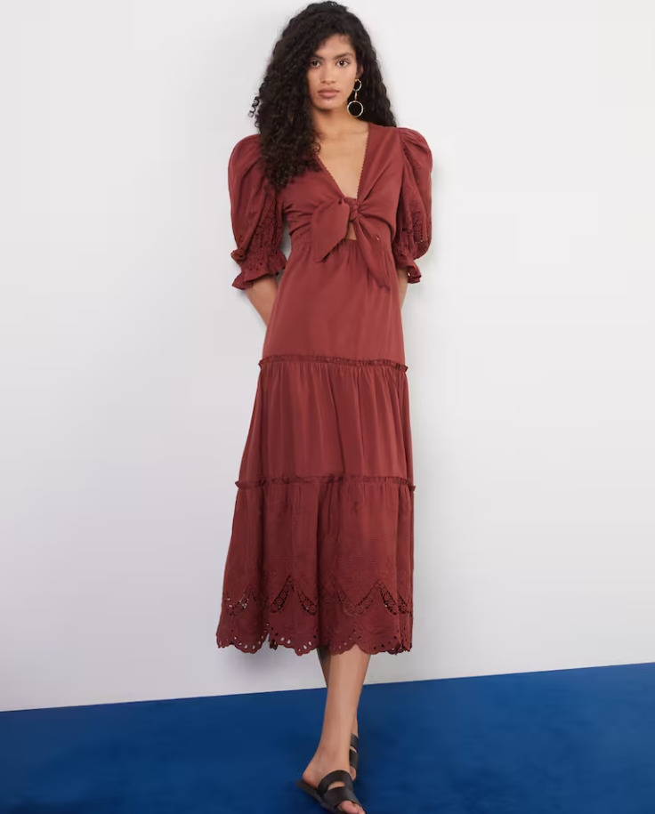 Para las que buscan una propuesta más elegante e igual de combinable, apta incluso para eventos, este vestido es la opción ideal. Se trata de un vestido midi liso de manga corta abullonada de lo más elegante. Tiene falda panelada y un escote en pico con lazo. Podrás encontrarlo a un 40% de descuento, con un precio final de 47,99 euros.