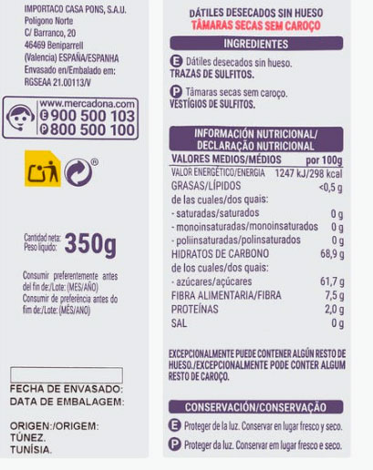 Según el portal digital de información nutricional Open Food Facts, los dátiles que se comercializaban bajo la marca Hacendado incluían hasta hace poco glucosa (azúcar), aceite de girasol (grasa) y conservante E-202. Sin embargo, los nuevos dátiles que ha puesto a la venta Mercadona, también de la marca Hacendado, carecen de todo ello.