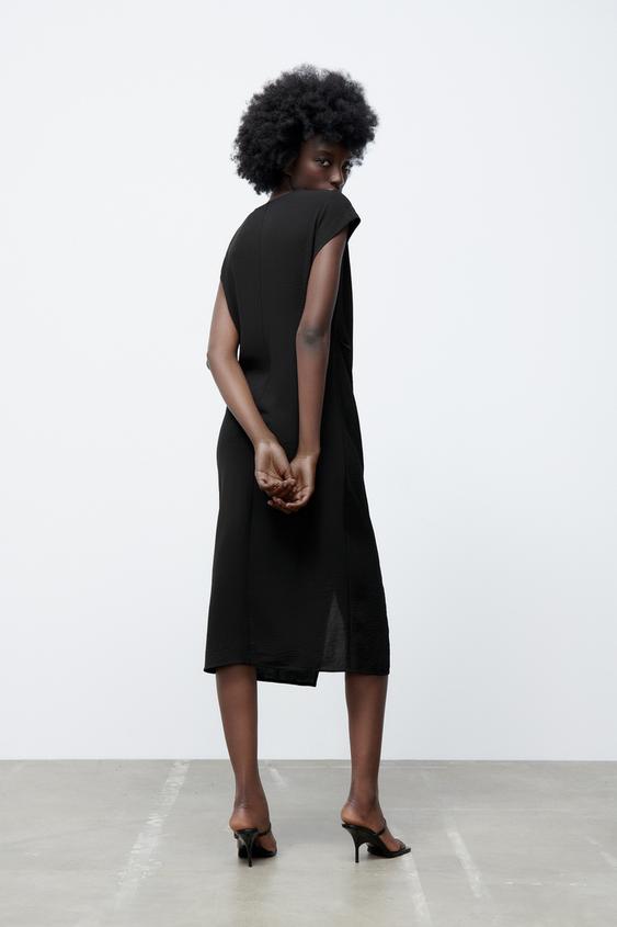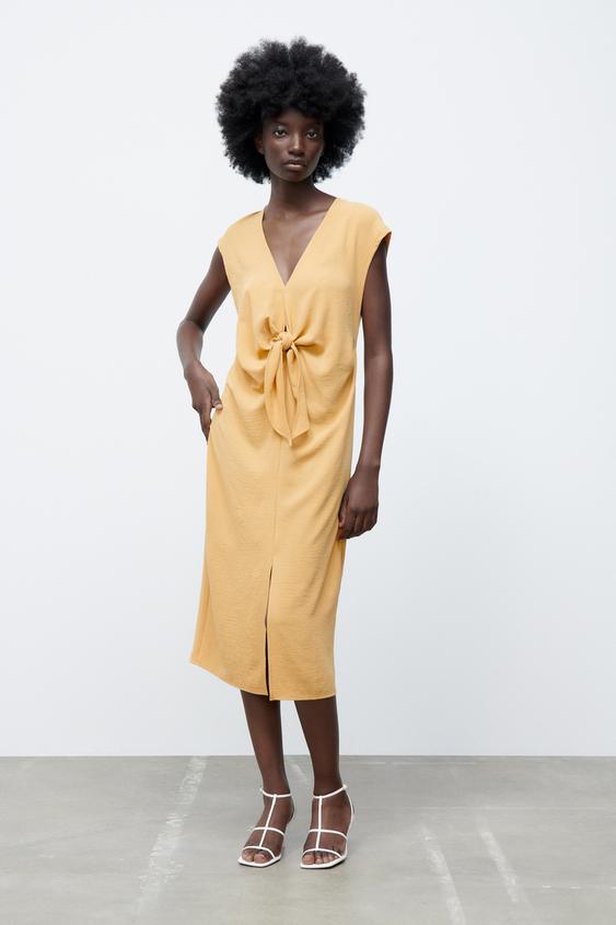 Y para más deleite hemos encontrado la combinación perfecta un vestido de Zara, atemporal y asequible. Concretamente estamos hablando de un vestido midi fluido de escote pico y manga sisa. Con detalle de nudo en delantero con pliegues y bajo acabado en abertura frontal.