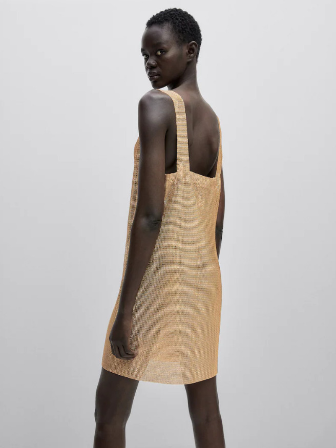 Su diseño en un llamativo color oro resulta muy favorecedor y esencial para esta temporada en la que los colores fuertes y llamativos siguen siendo toda una tendencia. El tejido es de aluminio con un diseño estilo malla, más fino en la zona del pecho para que tenga una elegante y ligera caída, mientras que en la parte inferior es más gruesa.