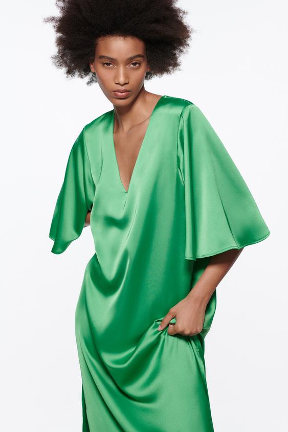 En la propia web de Zara hemos visto una muy buena alternativa y encima está de rebajas. Se trata de un vestido de escote pico y manga corta ancha, con bajo con aberturas laterales, satinado y también en color verde. Con un descuento del 30% este vestido cuesta solo 19.99 euros.