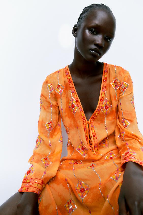 La primera opción de Zara es un vestido túnica de escote pico y manga larga, detalle de bordados y aplicación de lentejuelas combinadas a contraste. Con cierre frontal con lazadas en mismo tejido. Esta túnica en color naranja es un modelo súper atemporal, perfecto para el chiringuito pero que con el estilazo que tiene también nos lo querremos poner para una cena o una comida. Su precio es de 59.95 euros.