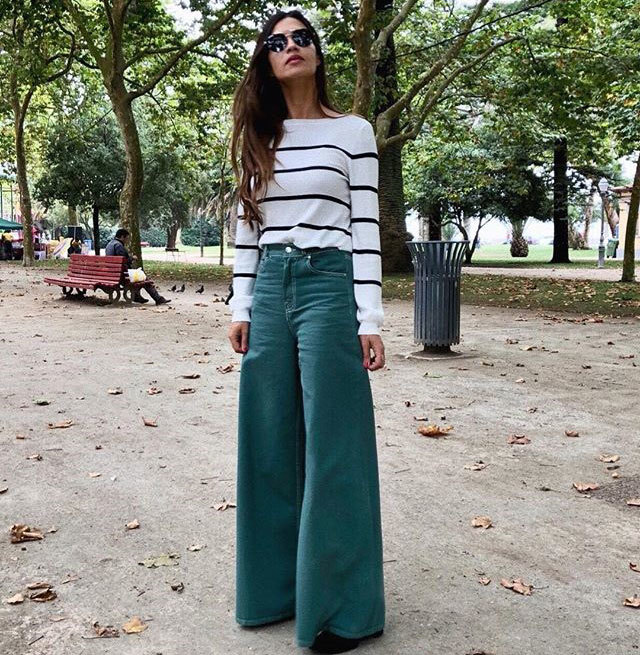 La periodista eligió un pantalón verde turquesa y un jersey fino marinero con rayas azules. Ella usó unas deportivas. Como se puede ver en la imagen le estiliza la figura y parece mucho más alta.