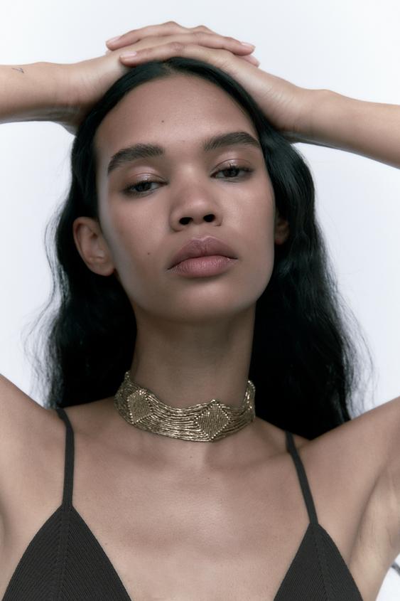 Otra opción más sencilla de Zara pero que también tiene mucho encanto es choker con abalorios y con cierre con mosquetón. En un tono gris antracita. Un choker de brillos, que es ideal para dar ese toque más sofisticado a un look. Con un vestido lencero negro y unas cuñas es una muy buena opción. Su precio es de 15.95 euros.