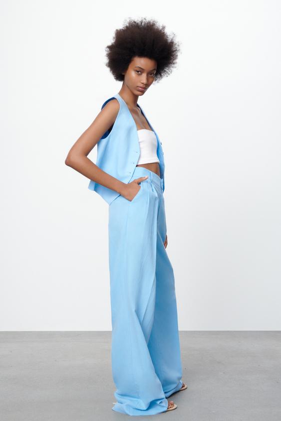 En concreto este look de Zara esta compuesto por un pantalón de traje de tiro alto confeccionado con tejido en mezcla de lino. Con bolsillos laterales y falsos bolsillos de vivo en espalda, detalle de pinzas marcadas en delantero y cierre frontal con cremallera, botón interior y gancho metálico. Con un precio de 29.95 euros.