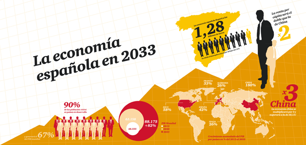 El PIB mundial será prácticamente el doble que el actual ( 82%), pero Europa habrá perdido una cuarta parte de su peso en la economía mundial. China habrá multiplicado su volumen por tres y en siete años superará a Estados Unidos se mire por dónde se mire, excepto en renta.