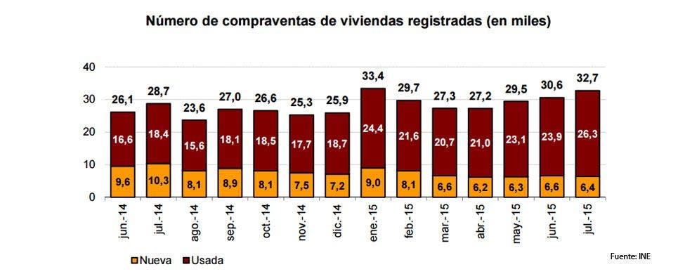 Del total de operaciones inscritas en julio, el 80,5% correspondió a vivienda usada, con 26.319 operaciones, lo que arroja un aumento del 43,1% y encadena 17 meses seguidos al alza. El 19,5% restante eran inmuebles nuevos, el 38,1% menos, hasta alcanzar las 6.395 unidades.