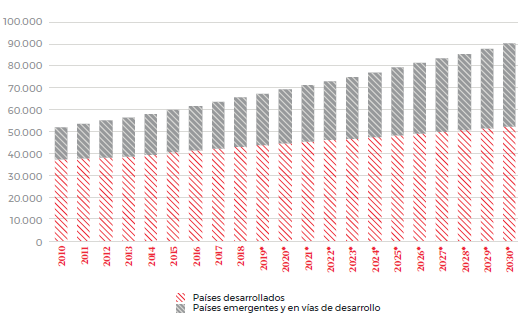 Ingreso bruto a nivel global, 2010-20130 (en billones de dólares). Fuente EAE