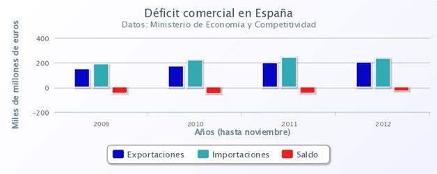 El déficit comercial ha caído el 29,5% hasta noviembre de 2012 respecto al mismo periodo de 2011. Así, el dato se ha situado en los 29,4 millones de euros durante los 11 primeros meses del año pasado, según el Ministerio de Economía y Competitividad.