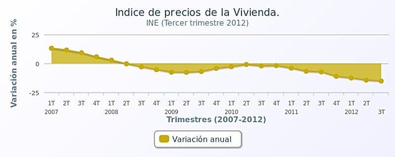 Desde inicios de 2011, el precio de la vivienda libre ha ido cayendo de manera considerada. Esta tendencia negativa se ha mantenido durante 2012, con caídas del 12,6% en el primer trimestre y del 14,4% el segundo, que se suman al 15,2% registrado hasta octubre de este año. La tasa trimestral ha descendido el 3,8%, pero es desde el tercer trimestre de 2010 que el precio de la vivienda libre muestra tasas negativas.