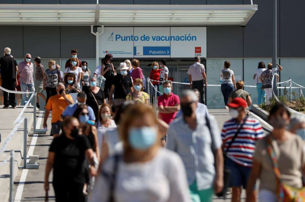 Centenares de ciudadanos esperan su turno para vacunarse en el hospital Enfermera Isabel Zendal. EFE/ Mariscal