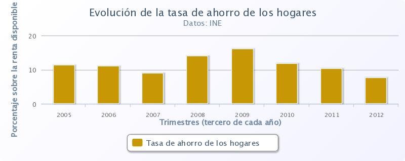 La tasa de ahorro de los hogares españoles ha caído 2,6 puntos hasta el 7,6% durante el tercer trimestre de 2012 frente al 10,2% registrado el mismo periodo de 2011. Este dato supone dos trimestres consecutivos en positivo.