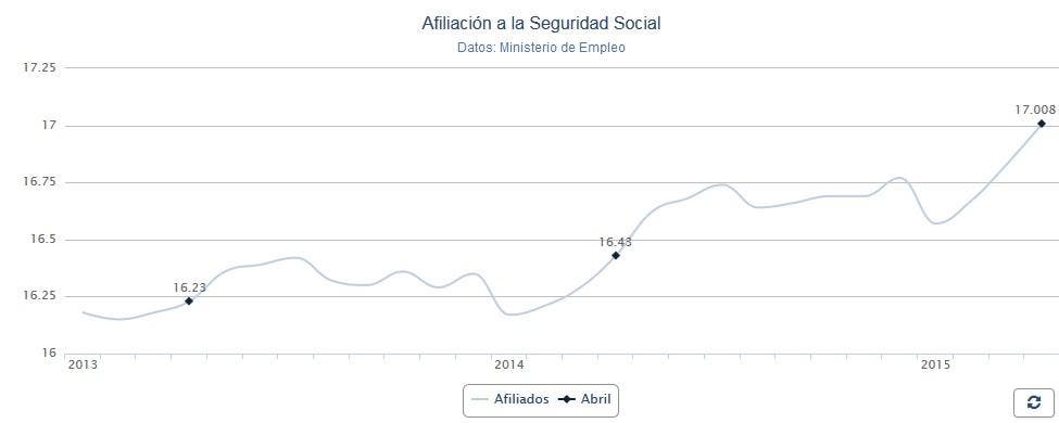 La afiliación a la Seguridad Social ha crecido en 175.495 personas en abril con respecto al mes anterior, lo que supone un aumento del 1,04%, y sitúa el número de adscritos en el sistema en algo más de 17 millones de ocupados.