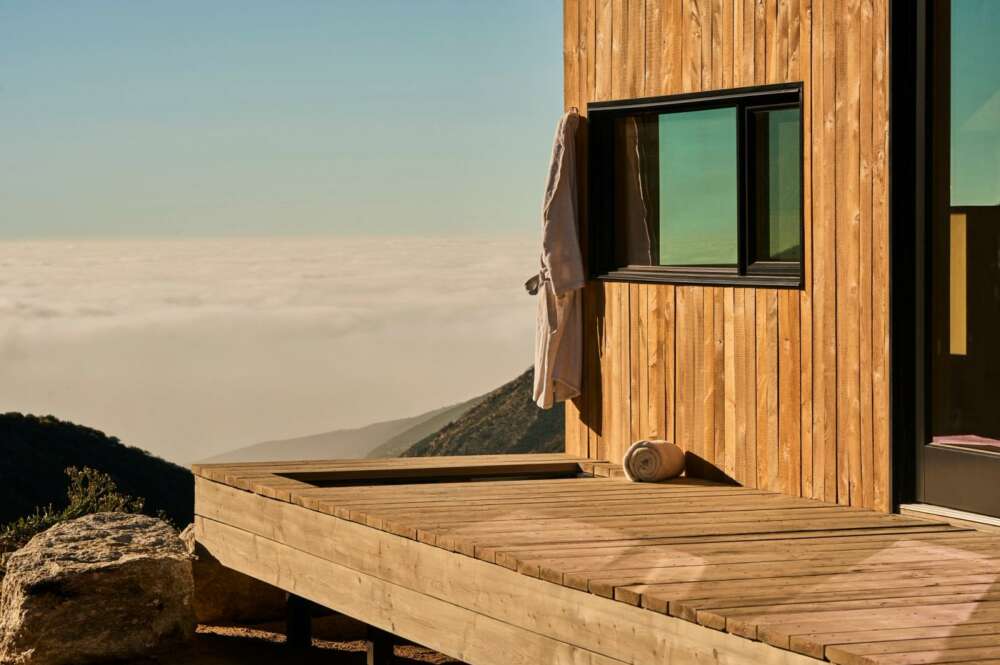 El interior tiene una ducha coronada por un tragaluz, un espacio tipo loft sugerido como rincón de lectura, una chimenea a leña, una cama doble y una terraza con el toque chic de una bañera exterior; que por su configuración parece estar flotando en el aire.