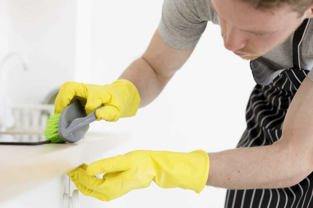 trabajador del hogar limpiando con guantes la esquina de un mueble