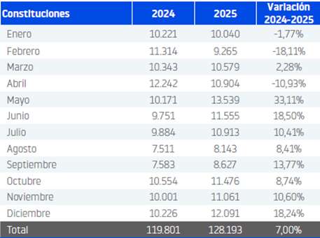 El último mes de 2025 fue clave para alcanzar el récord anual, con más de 12.000 nuevas sociedades inscritas solo en diciembre. Este volumen sitúa al mes como uno de los más activos del ejercicio, reflejando un cierre de año especialmente dinámico en términos empresariales.