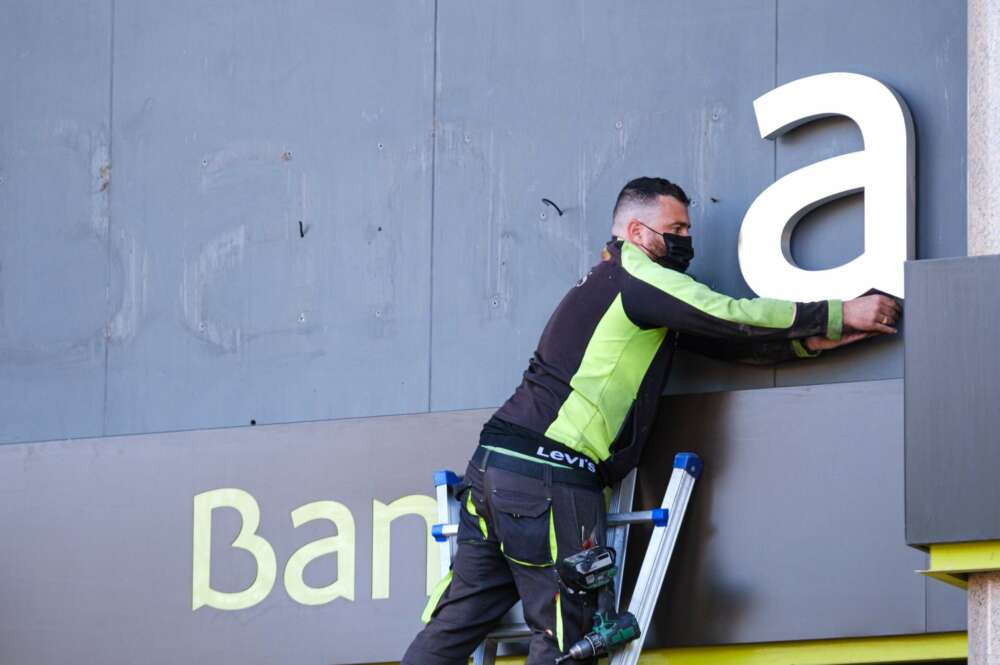 Los operarios desmontan el rótulo de Bankia de la sede principal del banco en Logroño, en 2021. EFE/Abel Alonso
