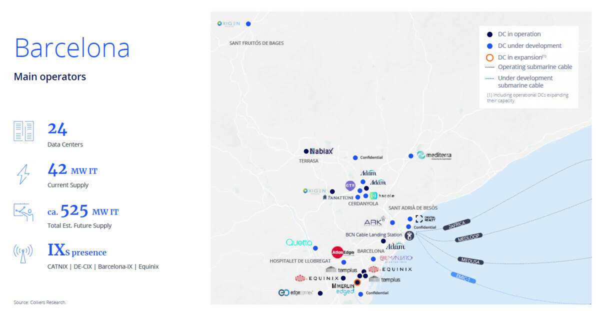 Castilla-La Mancha y Castilla y León actúan como zonas de desbordamiento natural de la capital. Y operadores como Ark Data Centers, recién llegado a Barcelona, o EdgeMode, con proyectos en Cáceres, Córdoba y Albacete, representan la nueva oleada de actores que apuesta por mercados secundarios.