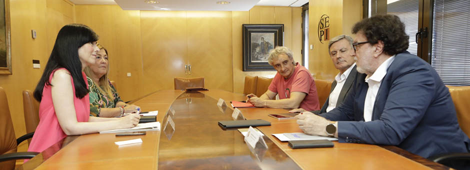 La presidenta de Sepi, Belén Gualda; la subsecretaria de Vicepresidencia primera de Gobierno y Ministerio de Hacienda, Lidia Sánchez Milán; el presidente de Correos, Pedro Saura, entre los responsables sindicales Regino Martín (CC OO) y José Manuel Sayagués (UGT), en julio de 2024.