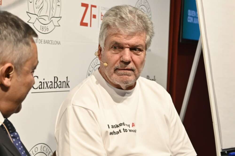 El expresidente de Telefónica, Juan Villalonga, ha roto el perfil bajo que le ha caracterizado en los últimos años para hacer un alegato de la inteligencia artificial en el Círculo Ecuestre de Barcelona. Más allá de las palabras que ha pronunciado durante sus intervenciones, su vestimenta era toda una declaración de intenciones, que contrastaba con las americanas que llevaban la mayor parte de los asistentes: una camiseta con el mensaje ‘pregunté a la IA qué ponerme’.